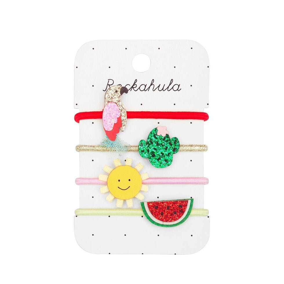 This four pack of ponies will bring all the island vibes to your hair! Featuring Pandora Parrot, a glitter cactus, a smiling sunshine and our juicy watermelon. All secured onto our sturdy elastics, this set is perfect for island adventures!